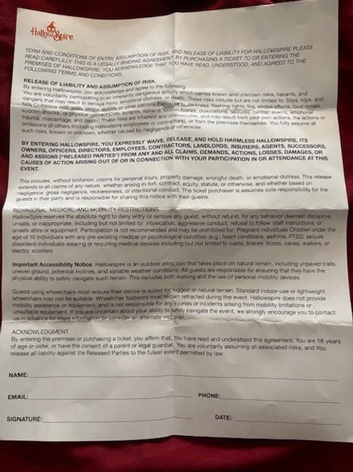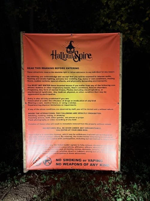 Everyone knows that I can’t do a review without talking about safety. It may seem like a boring thing to discuss- but it’s essential to a good show. The art of making patrons feel like they’re in grave danger while they are perfectly safe is difficult and at the heart of what we do. HallowSpire takes safety seriously. When you exit the parking lot, there is a huge orange sign, you seriously can’t miss it and it explains who should and should not be coming into the show. If you would like, you can read it in full below.